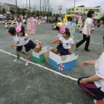 黄いろ帽の年長さんは自分たちの種目はもちろん、赤帽さんやみどり帽さんの競技のお手伝いに駆け回るなど、まさに大活躍の一日。最後に園長先生やPTA会長さんからごほうびをいただき、ニッコリの子どもたちでした。