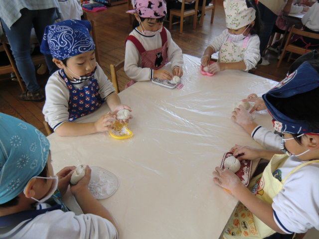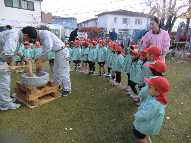 園内でPTA主催の餅つきがありました。大勢のお父さん、お母さんが朝早くから来園し、餅つきの準備に取り掛かっていただき、午前10時過ぎは早くも一番釜の餅米が炊き上がりました。「よいしょ、よいしょ!」の元気で可愛い掛け声に、お父さんたちの杵をふるう腕にも自然に力が入ります。次々とつきあがった餅は年少組はお母さんたちの手で、そして年中、年長組はこどもたちが自分で餅を丸めてあんころ餅を作りました。いろんな形の餅が出来上がり(笑)! でも、つきたての柔らかな餅は本当に美味しかったね。ほとんどの子どもたちがあんころ餅と黄な粉餅をペロリと平らげ、給食のうどんにも挑戦していました。お父さん、お母さん、美味しいお餅をありがとう!
