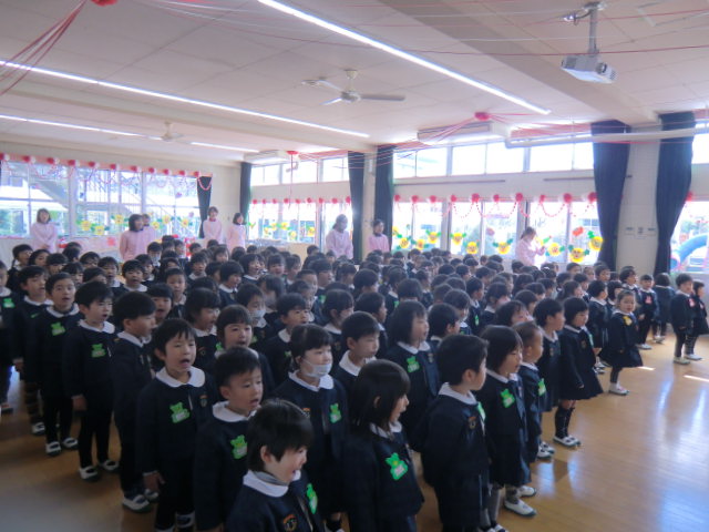 前日に年長組の子どもたちを卒園式で送り出し、続いて在園の子どもたちの年度修了式を行いました。1年間の生活でそれぞれに身も心も大きく成長した子どもたち。ステージに上がった代表の子どもたちからは、この1年で自分が一番がんばったことが発表され、友達から盛んな拍手を浴びて胸をはっている姿が印象的でした。4月からはいよいよ進級。小さなお友達(年少組)も新しく入園してきます。お兄さん、お姉さんとしての活躍を期待しましょう!!