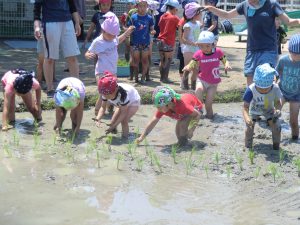 初夏の暑さの下、年長の子どもたちが園内の水田で田植えをしました。お兄さん、お姉さんたちががんばっていたお米作りに今度は自分たちが挑戦するということで、大喜びの子どもたちが多くみられました。中には泥に触れることが苦手な子もいましたが、がんばって田んぼの中を進み、稲の苗を手際よく植えている姿にホッとひと安心…。はじめは要領がつかめず、苗が寝てしまったり浮いてしまったりといった様子もみられましたが、2回、3回と慣れるにしたがってとても上手に植え付けることができてびっくりしました。「稲刈り、したいねぇ」、「たくさんお米がとれたらいいのにね」といった声があちらこちらから聞こえてきましたよ。黄色帽さん、これから夏の間の〝田の草取り〟のお手伝い、よろしくお願いしますね!!