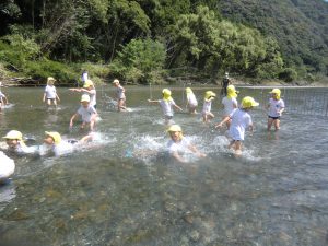 7月から延期となっていた年長組の川遊びが実施されました。絶好の天候ではありましたが気温が高く、また新型コロナウィルス感染拡大中ということで、両方への対策を万全に取りながらの実施となりました。川は清流で子どもたちの遊びに適しており、子どもたちは大喜びで川遊びに夢中になりました。お父さん役員の万全のサポートを受けながら、安全に配慮し、自然の中での川遊びを満喫できたと思います。午後はプチ・ハイキングと吊り橋渡り!! 長くて高い吊り橋に子どもたちからは歓声が上がりました。ちょっぴり怖い子も友だちに励まされながら頑張って渡りとおし、対岸についた時にはホッとした表情とともに自信もうかがわれ、復路の吊り橋再アタックでは、しっかりとした足取りで渡り切れていたのには驚かされました。暑い中、充実した一日を過ごした子どもたち。帰りのバスでは夢の世界に入ってのお昼寝…。可愛かったです!! 暑い中を早朝より安全管理のための環境整備等にお力添えいただいた保護者会長さん、並びにお父さん役員の皆さん、大変お疲れ様でした。そして本当にありがとうございました。