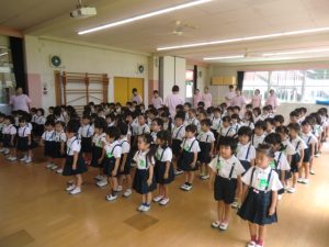 満3歳児から年中までの子どもたちが園内で一学期の終業式に参加しました。入園、進級以来約4ケ月の園生活でしたが子どもたちは日に日に新しい環境に慣れ、園生活を楽しんでいる様子がよくわかります。7月に入ってからは毎日厳しい暑さが続きましたが、毎日、額に大粒の汗を光らせながら園庭を駆け回る様子は頼もしささえ感じました。ここ一週間ほどは熱中症アラートが出ていたため屋外での遊びは控え気味でしたが、涼しい室内でも友達と一緒に楽しい遊びを満喫した子どもたちです。 終業式ではクラスごとに整列する姿が様になり、お話を聞く態度もしっかりと身について立派でした。8月下旬の夏季保育では、また元気な顔が揃うことを期待しています!!
