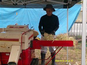 園内の田んぼで収穫した稲を干し、今日はいよいよ脱穀の日。しかし朝から不安定な天気で時折小雨も降ってきて、苦肉の策で田んぼにテントを張り、その下で脱穀をしました。以前の園バスの運転手だった大石さんが脱穀機を持ちこんで下さり、興味津々な子どもたちの目の前で次々に稲を機械に入れ、脱穀を進めてくれました。「みんなが食べるお米にするためには、これからまだまだお世話しなければならないんだよ」と説明を受けて、いつも口にするお米の大切さを噛みしめた子どもたちでした。これから籾すり、そして精米へと作業を進め、いよいよ11月17日の創立記念日には給食でこのお米を食べることになります。6月初めの泥遊びから田植え、お世話、脱穀、そして最後の精米まで、子どもたちがいつも見守ってきた稲との生活の集大成、楽しみですね!!